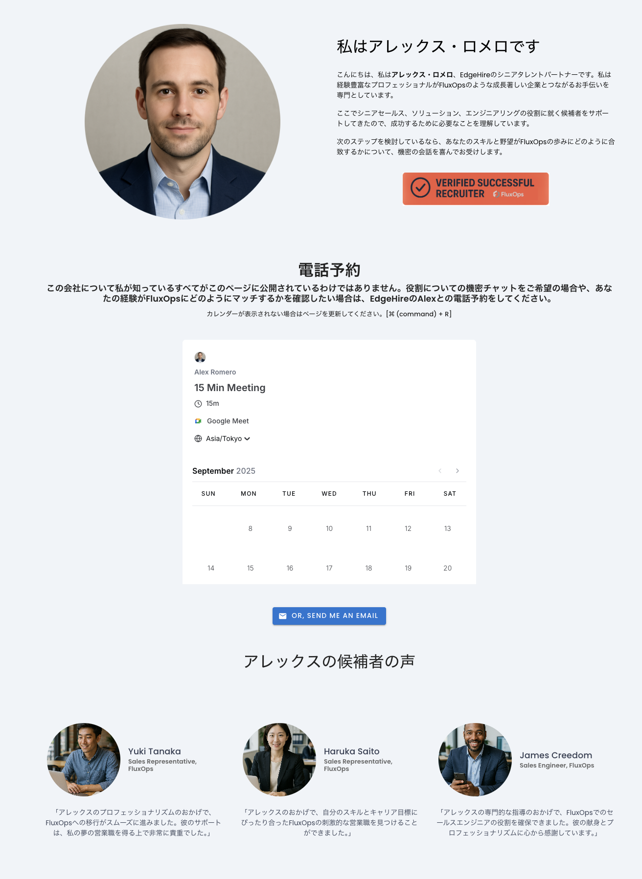 エージェント/リクルーターのプロフィール追加(写真、説明、ロゴ、推薦文、カレンダー埋め込みなど)